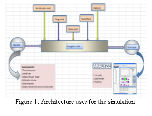 The architecture is designed in such a way to study the characteristics of the output signal with the different effects of the propagational parameters. In the figure 1, the propagation models module includes the fading model, shadowing model, rainfall attenuation model and vegetation attenuation model.