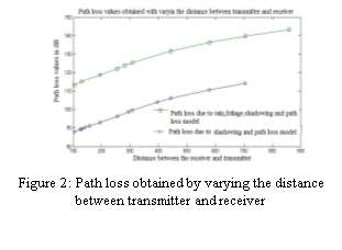 From the investigation of the graph shown in figure 2, a 40 dB difference in the path loss estimated without the effect of the environmental factors than with the effect of the environmental factors.