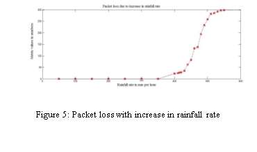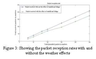 The packet reception rate is analyzed with the combined effect of the environmental factors like the rainfall rate and the distance of propagation through foliage. The result in figure 3 shows the packet loss due to the effect of environmental factors is higher than the scenario where there is no effect of environmental factors. This is due to the rainfall attenuation and the foliage effect. Analyzing the effects of these two factors is needed drastically to find out the minimum level of rainfall rate and the distance of propagation through foliage which affects the degradation of the signal.
