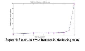 From the analysis of the simulation result, it is clear that the packet loss started when the shadowing mean is above 4dB. All the packets are lost when the shadowing mean is above 11dB.