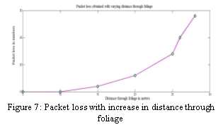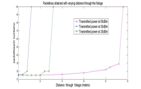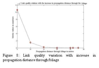 In figure 7, the simulation result of foliage model is shown. If the distance through foliage is more than 10 meters, it will affect the packet reception rate. The link quality is also analyzed with the variation in the distance through foliage.