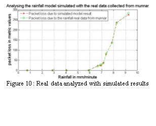 The real data from landslide monitoring system is analyzed with the simulated result in the Qualnet with the combined effect of the environmental parameters like the rainfall rate, foliage, shadowing and fading. The result holds the fact that the models were showing similar results as in theoretical models.